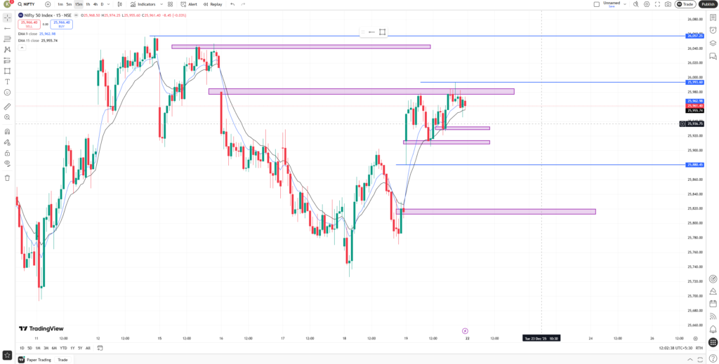| Major Resistance | 25,977 – 25,984 zone + liquidity level 25,993 |